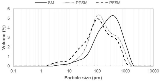 Volume–particle size distributions (representative curves) for obtained powders. SM, snake melon; PPSM, snake melon with pea protein; PFSM, snake melon with pea fibre.