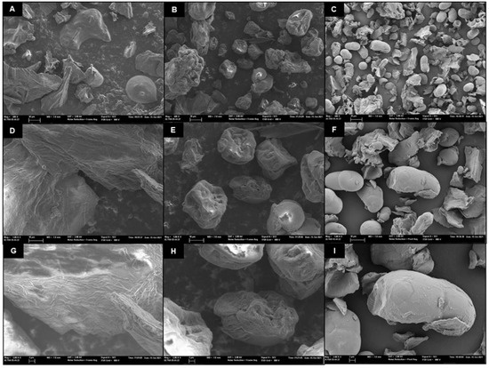 FESEM micrographs with ×400 (A–C), ×1000 (D–F), and ×2000 magnifications of the studied powders: snake melon (A,D,G), snake melon with pea protein (B,E,H), and snake melon with pea fibre (C,F,I).