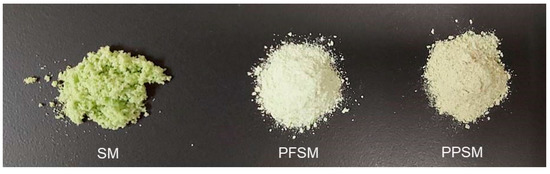 The appearance of the studied SM powders is shown in Figure 4. Visual differences can be seen in both the colour and flow of the powders. The powders with PP or PF were less green but more fluid, as indicated in Table 2. Furthermore, SM appeared to form small aggregates and was more hygroscopic. Despite the differences, the three powders had good appearances. PPSM and PFSM stood out for having more powder-like appearances.