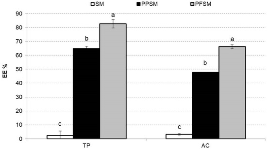 Figure 5 shows the TPs and AC EE% for the SM freeze-dried samples. The EE represents the potential of the wall material to encapsulate or hold the core material inside the microcapsule [38]. The EE is also related to the shelf life of the phenolic compound content and the AC in the powder. The low EE% for the TPs and AC of the powder without biopolymers stood out, but this behaviour was expected considering that it did not contain carrier agents encapsulating the bioactive compounds in its formulation. The PPSM EE% values for TPs and AC were like those obtained with other vegetable powders encapsulated with pea protein [24]. PFSM presented the highest EE% for TPs and AC, showing significant differences compared to PPSM (p < 0.05). Relating these results to Figure 3, the smooth-surfaced oval or spherical particles were probably a more consistent barrier to bioactive compound degradation than with PPSM, which presented wrinkles on the surface and more irregular shapes.