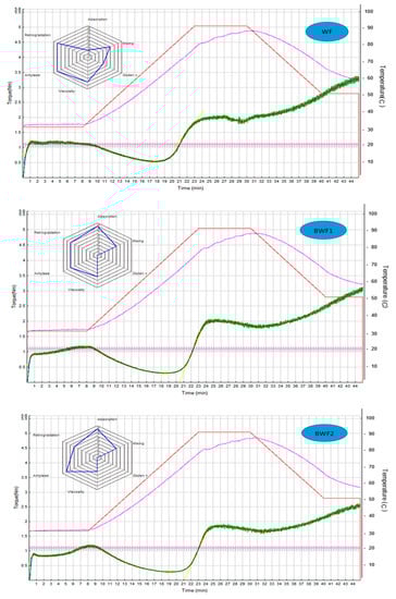 Mixolab rheological profiles of the analyzed flour samples (WF, BWF1, BWF2, and BWF3).