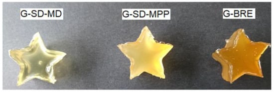 As also shown in Table 2, the gumminess and chewiness of gummy candies prepared with maltodextrin microcapsules (G-SD-MD) were higher compared to those formulated with non-microencapsulated betaxanthins (G-BRE). The increase in these textural properties in the G-SD-MD samples is attributed to the presence of maltodextrin polymers in the formulation of the microcapsules that were incorporated in the preparation of gummies. The presence of these microcapsules in the formulation of sweet gums supports the gel matrix, promoting the union between the gelatin chains to produce defined shapes [25]. On the other hand, the decrease in the gumminess and chewiness values of the gums prepared with G-SD-MPP mucilage microcapsules compared to the G-SD-MD samples may be associated with the disposition and interaction of the mucilage with the ingredients of the formulation of gummy candies [67].