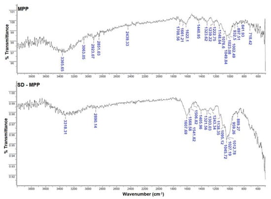 The FTIR spectra of the wall materials (i.e., mucilage (MPP) and maltodextrin (MD)) and of the microcapsules SD-MPP and SD-MD are presented in Figure 3 and Figure 4.
