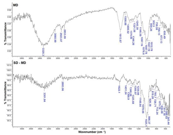 FTIR spectra in the 500–4000 cm−1 range of maltodextrin (ED-20) powder (MD) and betaxanthin MD microcapsules (SD-MD).