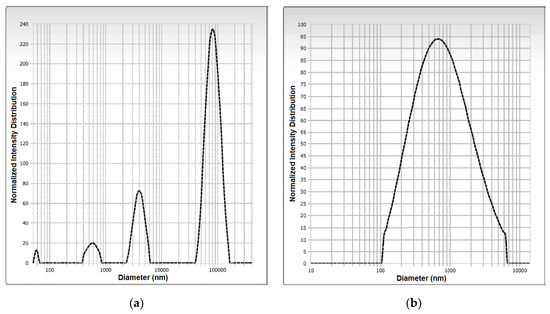 As shown in Figure 5, the average particle size of the microcapsule samples formulated with maltodextrin and mucilage was 1.24 ± 0.16 and 65.01 ± 3.32 µm with polydispersity indices of 0.34 ± 0.00 and 2.58 ± 0.07, respectively. These values allow the powders obtained to be to classified effectively as microcapsules [50] within a desirable size range (i.e., radius < 100 μm), in such a way that they will not affect the sensory characteristics when applied in a food matrix [51]. SD-MD microcapsules show a smaller particle size compared to SD-MPP microcapsules. Consistent with drying theories [14,52], this increase in the particle size of SD-MPP microcapsules may be related to a high viscosity of the feed solution. On the other hand, the decrease in particle size of SD-MD microcapsules can be correlated with the molecular size of maltodextrin (ED-20) and the bulk density of the powder [53]. Similarly, Negrao-Murakami et al. [54] obtained microcapsules of concentrated mate formed with maltodextrin (ED-20) with a particle size of 12.37 ± 1.57 μm.