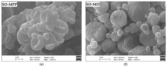 The SD-MD microcapsules observed at 1000× magnification (Figure 6d) showed a homogeneous morphology with little agglomeration and a monomodal distribution that is consistent with the results obtained in the measurement of the particle size distribution (Figure 5b). The homogeneity of the powder indicates that these spheres could be used in any food product to enhance its coloring properties. As for the SEM micrographs taken at 5000× magnification (Figure 6f), they show how small (radius = 1.24 ± 0.16 µm) SD-MD particles present a dented appearance with a higher degree of wrinkled surfaces than larger SD-MPP particles (radius = 65.01 ± 3.32), possibly due to the contraction of the particles during the drying process, which can be influenced by the high drying speed, the viscosity of the feed mixtures, and the characteristics of the wall material [62]. Janiszewsk [63] reported a similar morphological structure in beetroot juice microcapsules using maltodextrin as encapsulating agent.