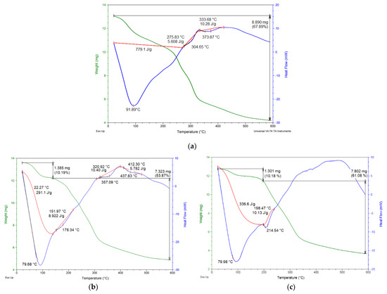 TGA/DSC thermograms of mucilage (a), SD-MPP (b), and SD-MD (c) microcapsules. Heat capacity (J/g °C) (red line).