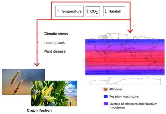 The Latin-American scenario foresees significant temperature rises and a reduction in soil water content. Rainforest will turn into savannah-like grassland, and semi-dry soil cultures will be replaced by dry vegetation. Tropical species will perish in significant amounts and numbers, and crop productivity will drop [93]. In North America, floods and high temperatures will lead to storage-related problems in favour of mould growth and mycotoxin production. In regions currently characterized by a subtropical climate, such as the southern United States, the production of tropical cultures, such as coconut, maize, soy, coffee, and cocoa, may reach an optimum [94]. Elevated carbon dioxide atmospheric representation, temperature rise, and extreme amounts of precipitation exchanging with droughts are expected in parts of North and South America; for instance, in Brazil, as well as in Africa and Asia [87]. Operating under the assumption that tropical climate shall gradually become typical of subtropical regions, there is an expectation that developed countries will better cope with more severe mycotoxin contamination of tropical cultures than developing countries [87].