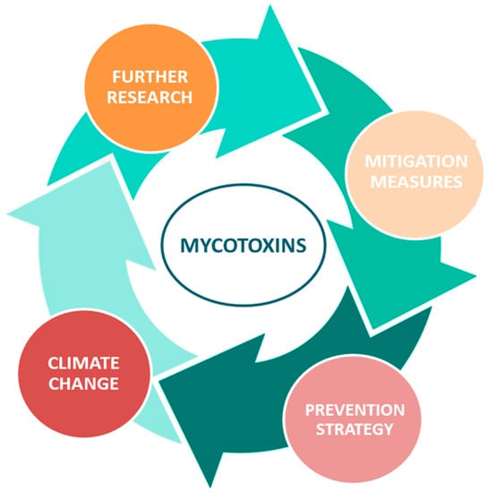 Rapidly growing food and feed contamination face a great challenge from current as well as predicted climate change, and therefore there is a requirement for reinforced measures based on the multidisciplinary approach, including prevention strategy, mitigation measures, and further research (Figure 2).