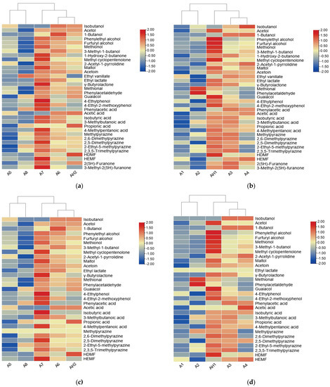 - Liang, R.; Huang, J.; Wu, X.M.; Fan, J.; Xu, Y.; Wu, C.D.; Jin, Y.; Zhou, R.Q. Investigating the differences of flavor profiles between two types of soy sauce by heat-treatment. Int. J. Food Prop. 2019, 22, 1998–2008. [Google Scholar] [CrossRef]
