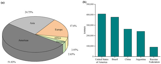 The continuous development of agriculture intensifies the application of pesticides globally to reduce crop yield losses and increase productivity and product quality [2]. Proximately 2 million tons of pesticides are currently applied to crops worldwide each year to increase productivity and reduce losses from pests and diseases [3]. According to the Food and Agricultural Organization (FAO) of the United Nations, the United States of America was the largest user of pesticides in 2020, while the next 10 largest pesticide users in the world are Brazil, China, Argentina, the Russian Federation, Canada, France, Australia, India, and Italy [4]. In the 2022 update, FAO reported that total pesticide use in China significantly decreased, moving China to third place in pesticide usage globally [4]. However, even though a plateau has been reached in recent years, total pesticide use has increased by approximately 50% compared to the 1990s [4]. The pesticide use by region and the top five largest pesticide users in the world are shown in Figure 1.