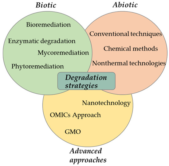 Several biotic and abiotic degradation strategies have been developed and continuously improved to minimize human exposure to pesticides and their potential adverse environmental effects. Various biotic and abiotic techniques applied for OP degradation are presented in Figure 2. The biotic strategy includes transformation processes mediated by microorganisms, fungi, or plants, while the abiotic strategy implies the direct chemical or mechanical breakdown of pesticides into non-toxic forms. The types of transformation processes by which a pesticide will degrade depend on its structural affinity for specific types of transformation and the environmental conditions to which it is exposed [79].
