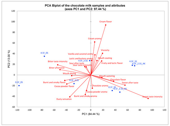 In Figure 1, PC1 (84.44%) mainly describes the variation in the samples related to sweetness and bitterness, with sweet taste intensity, sweet aftertaste, chocolate flavor and mouth-watering in the lower right-hand corner and bitter taste intensity, bitter aftertaste and mouth-drying in the upper left-hand corner. Samples 4.5F_5S, 4.5F_2.5S_AK, 0.1F_5S and 0.1F_2.5S_AK were evaluated as high in relation to the attributes related to sweetness, while samples 4.5F_2.5S and 0.1F_2.5S were characterized by high bitter taste intensity. PC2 (13.00%) mainly describes variation related to fat concentration, with cream flavor, cream aroma, viscosity and vanilla and caramel aroma at one end (samples 4.5F_0S, 4.5F_2.5S, 4.5F_2.5SAK) and dusty sensation, burnt and smoky aroma, cocoa powder aroma and cocoa powder flavor (samples 0.1F_0S, 0.1F_2.5S, 0.1F_5S, 0.1F_2.5S_AK) at the other end. The samples where part of the sucrose was replaced with acesulfame-K (0.1F_2.5S_AK and 4.5F_2.5S_AK) were placed close to the samples with 5% sucrose (0.1F_5S and 4.5F_5S) in the PCA biplot and were therefore—in accordance with the results from the ANOVA—very similar in their sensory profile. This illustrated that the substitution of 2.5% sucrose with acesulfame-K did not alter the sensory profile of the chocolate milk except for the change in sweetness intensity.