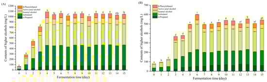 Changes in higher alcohols of JM and CM during fermentation. JM (A) and CM (B) were fermented by Jinhuangtian Jiuqufrom Heyuan Jinhuangtian Liquor Co., Ltd. and Changleshao Jiuqu from Guangdong Changleshao Co., Ltd., respectively (mean ± SD, n = 3). Columns with different letters indicate significant differences (p < 0.05).
