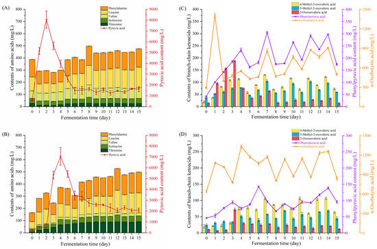Changes in higher alcohol precursors of JM and CM during fermentation (mean ± SD, n = 3). The contents of amino acids and pyruvic acid were shown in JM (A) and CM (B), and the ketoacids were shown in JM (C) and CM (D).
