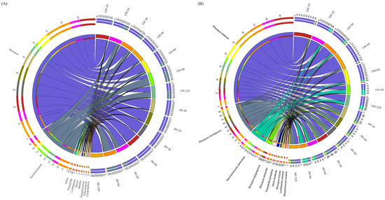 The correlation between microorganisms and enzymes involved in different metabolic pathways involved in the production of higher alcohols from JM (A) and CM (B).