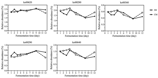 There were 59,593 (26.67%) unigenes in the gene catalog that were annotated within KEGG pathways. Five types of metabolic pathways were annotated according to the KEGG level 1 annotation, among which a large number of genes belonged to metabolism (Figure 5). Based on the level 2 annotation, the relative abundance of carbohydrate metabolism was the largest, followed by amino acid metabolism, indicating that microorganisms were enriched with genes involved in carbohydrates and amino acids during the fermentation process of rice-flavor Baijiu (Figure 5). In addition, among the level 3 pathways, ko00620 (pyruvate metabolism), ko00290 (valine, leucine and isoleucine biosynthesis), ko00280 (valine, leucine and isoleucine degradation), ko00640 (propanoate metabolism) and ko00360 (phenylalanine metabolism) were associated with higher alcohol synthesis. The variation trends of the relative abundance of ko00620 and ko00290 in CM and JM were similar to those of the other three pathways (Figure 6). As for JM, the relative abundance of genes involved in these pathways increased during the early fermentation stages (day 1 to day 4), suggesting that the microbiota in JM might be more active in higher alcohols synthesis.