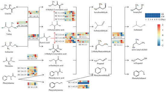 Inferred higher alcohol synthetic pathway and number of the annotated enzymes within the metagenomes. The numbers of the annotated enzymes are expressed in heat maps. The two rows represent CM and JM, and the seven columns represent the fermentation time points (1, 2, 3, 4, 6, 9 and 12 days) in each heat map.