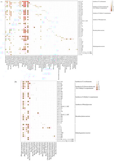 The relationship between microorganisms at the species level and enzymes involved in higher alcohol metabolic pathways is shown in Figure 8. In general, Rhizopus and Saccharomyces were most involved in most processes of higher alcohol biosynthesis in JM and CM. However, there were more microorganisms involved in the synthesis of higher alcohols in JM than in CM. Besides Rhizopus and Saccharomyces, there were other functional microorganisms involved in the biosynthesis of higher alcohols in JM, especially Absidia, Lichtheimia and Bacillus, which could be involved in the synthesis of immediate precursors, including 𝛼-oxobutyric acid, α-ketoacids and phenylpyruvic acid (Figure 3). In addition, Hesseltinella was observed in JM as a producer of aminotransferase, decarboxylases, and dehydrogenase in the Ehrlich pathway. It was found that the dominant microorganisms annotated with decarboxylases (EC 4.1.1.-) in CM at the species level were R. oryzae and S. cerevisiae, and pyruvate decarboxylase (EC 4.1.1.1) was annotated only in Rhizopus microsporus. Besides R. oryzae and S. cerevisiae, the dominant microorganisms annotated by EC 4.1.1.- in JM included R. microsporus and H. viculosa, and EC 4.1.1.1 was also annotated only in R. microsporus. As shown in Figure 4, the relative abundance of R. microsporus was higher in JM than in CM, which may be one of the reasons for the higher content of higher alcohols in JM than in CM. As expected for Saccharomyces, Rhizopus has been reported to produce n-propanol, 3-methylbutanol and other volatiles during fermentation [39,40]. Furthermore, the abundance of Rhizopus in Xiaoqu was more important than that in Daqu because it was closely related to starch hydrolysis, alcohol fermentation and flavor [41]. Therefore, the comprehensive analysis between microbiota, functional genes, and higher-alcohol-related compounds indicated that R. delemar, R. microsporus, and S. cerevisiae might be the most important functional microorganisms for the synthesis of higher alcohols in rice-flavor Baijiu.