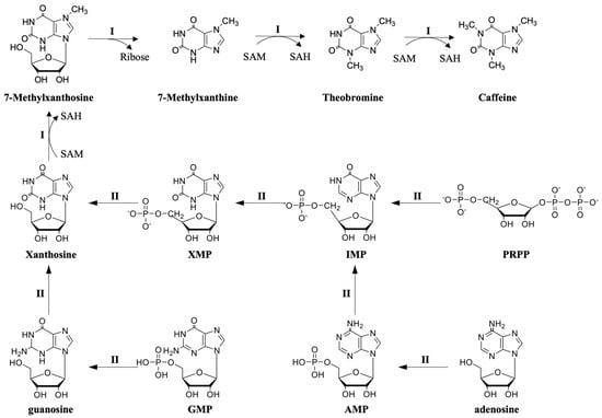 Xanthosine serves as the initiator of caffeine synthesis and can be synthesized through four main pathways (route II in Figure 1):