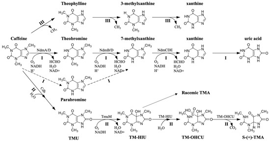 Worldwide, at least 71 bacterial strains belonging to 27 genera are involved in caffeine degradation [36], among which Pseudomonas is the most common and studied caffeine-degrading strain. In Pseudomonas, the metabolism of caffeine is composed of two metabolic pathways: N-terminal demethylation and C-terminal oxidation. These two degradation pathways often coexist in bacteria, and the N-demethylation pathway is the main pattern of caffeine degradation in bacteria.
