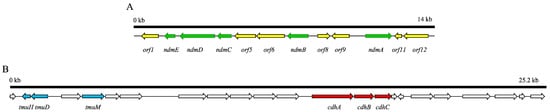Currently, there are numerous studies investigating the gene sequences of Pseudomonas putida CBB5, Pseudomonas sp. NCIM 5235, and Paraburkholderia caffeinilytica CF1 strains, which have the ability to degrade caffeine. The gene of Pseudomonas sp. NCIM 5235 has been sequenced, and its NdmABCDE gene sequence and length are similar to those of Pseudomonas putida CBB5 [58]. The caffeine-metabolism-related gene is about 14 kb in size (Figure 3A) and contains the NdmABCDE enzyme gene for demethylation and other functional genes. Orf1 (open reading frame 1) and orf12 are involved in formaldehyde metabolism and the main by-product formed after the demethylation of methylxanthine. Orf6 encodes a membrane protein homologous to purine permease, which may act as a transporter for methylxanthine in the cell. In addition, Orf8 encodes a transcription regulator belonging to the GntR family, which likely acts as a transcriptional repressor of methylxanthine degradation. The protein encoded by orf11 belongs to the VOC family and may play a role in oxygen chelation in the cell, thus contributing to oxidation reactions. The functions of orf5 and orf9 in methylxanthine metabolism remain unknown (Table 2). In the Paraburkholderia caffeinilytica CF1 strain, complete functional demethylation genes are also present, but the difference is that its caffeine degradation gene is located on a giant plasmid of 174 kb [59]; this was the first time that caffeine-metabolism-related genes have been found to exist on a plasmid.
