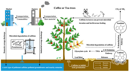 Caffeine is a natural protector of plants against pests and microorganisms in their environment. As the leaves mature and fall, the caffeine is released into the soil, which inhibits the germination of seeds in the surrounding plants. Certain microorganisms, such as Pseudomonas, are able to break down caffeine through N-demethylation and C-8 oxidation pathways. However, in our daily lives, caffeine can enter the water circulation system through the processing of plant-based ingredients and food consumption. Excessive amounts of caffeine can lead to water pollution, but the microbial degradation of caffeine provides a new method for addressing this issue (Figure 4).