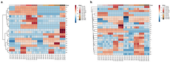 Variation of volatile components in mature and immature jujube honey during Z. rouxii contamination via HS-SPME-GC-MS. (a) Mature jujube honey; (b) immature jujube honey; “−3” for contamination with high-concentration Z. rouxii; “−4” for contamination with low-concentration Z. rouxii. (1) Methyl butyrate; (2) 2-Methyl-3-pentanone; (3) toluene; (4) octane; (5) p-Xylene; (6) 2-Methyl-5- pentyltetrahydrofuran; (7) o-Xylene; (8) nonane; (9) heptanal; (10) methyl hexanoate; (11) methyl heptanoate; (12) (E)-2-Octenal; (13) cis-5-Ethenyltetrahydro-α,α-5-trimethyl-2-furanmethanol; (14) α-Methyl-α-[4-methyl-3-pentenyl]oxiranemethanol; (15) linalool; (16) nonanal; (17) decanal; (18) methyl nonanoate; (19) methyl 2-nonenoate; (20) undecanal; (21) 2,6,10-Trimethyltetradecane; (22) methyl 11-methyldodecanoate; (23) cedrol; (24) methyl palmitate; (25) methyl 13-octadecenoate.