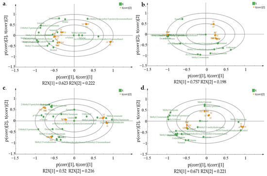 OPLS-DA biplot of mature and immature jujube honey in different contamination stages. (a) HMH; (b) LMH; (c) HIH; (d) LIH.
