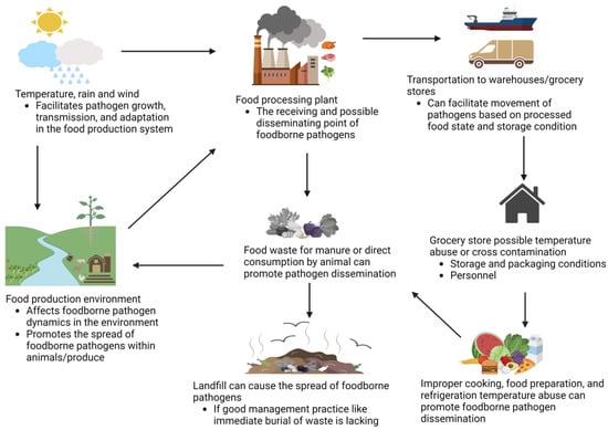 The number of foodborne infections is ever-increasing despite legislative and microbiological prevention strategies to ensure food safety and public health. Emerging pathotypes, sanitizer-resistant microbes, and interconnections along the supply chain, such as production environment, contaminated processing equipment/surfaces, and asymptomatic food handlers, are considered major challenges contributing to an increase in foodborne infections [1]. Food-producing animals (cattle, swine, and chickens), leafy greens, soil, and water are the main bacterial sources of foodborne infections. The risks of transmission of foodborne diseases are influenced by environmental conditions such as temperature, moisture, and various agricultural and industrial practices (Figure 1).