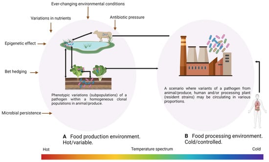 (A) Single-cell heterogeneity within food-production animal/produce (B) and a diverse pathogen population in processing environments. These diverse populations may arise due to response to environmental selective pressures and from cross-contamination events.