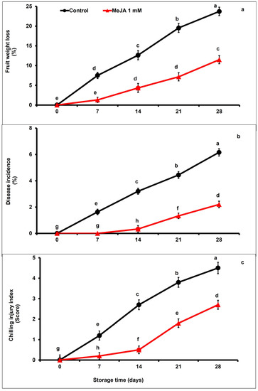 Exogenous MeJA maintained the nutritional composition of loquats [30], Chinese bayberries, and grapes [31,32] during low-temperature storage. In addition, MeJA application has been reported to improve quality traits of fresh produce by activating the antioxidant system and reducing the chilling injury in plums and red raspberry fruits throughout postharvest storage [33,34]. Furthermore, MeJA reduced chilling symptoms by increasing the activity of antioxidant enzymes in tomato berries [35,36], peaches [37], lemons [38], and bell peppers [39] stored at low temperature. Similarly, Rehman et al. [40] demonstrated that MeJA-treated Valencia orange (Midknight) fruits showed markedly lower chilling injury symptoms during cold storage. Furthermore, MeJA-treated carambola fruits markedly prevented chilling injuries and exhibited notable increase in ascorbic acid content and synthesis of protective molecules which enhanced quality traits by improving shelf life during long storage [41]. Similarly, MeJA and salicylic acid treatment enhanced the chilling tolerance and improved the total phenolics and oxidative phenolic enzymes activities in lemon fruits during cold storage [42]. Furthermore, exogenous application of MeJA significantly decreased internal bruising, delayed senescence, and retained sensorial quality and, consequently, the shelf life of eggplants [43]. Moreover, González-Aguilar et al. [19] reported that postharvest MeJA application significantly inhibited the fungal decay, chilling development, and firmness deterioration of papaya fruits stored for 14–32 days at 10 °C and 4 days’ shelf life at 20 °C.
