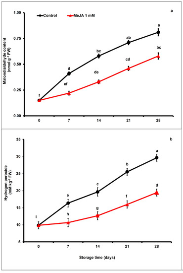 The hydrogen peroxide (H2O2) production rate significantly increased in both MeJA-treated and untreated papaya fruits during the storage period (p < 0.05; Figure 2b). Nevertheless, a marked increase in H2O2 content was noticed in the control compared to the MeJA-treated papaya fruits. On day 28 of the storage period, hydrogen peroxide accumulation in MeJA-treated papaya fruits was approximately 1.52-fold lower than in untreated fruits (Figure 2b).