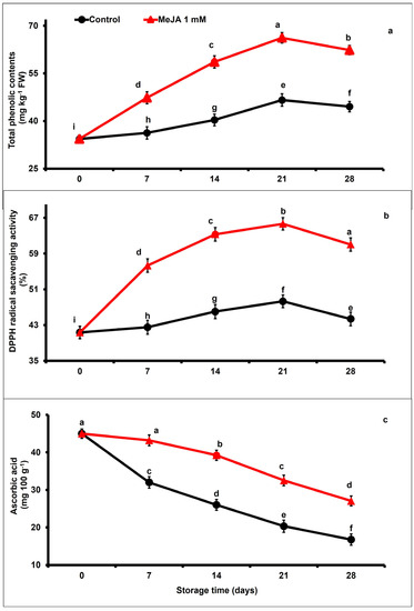 Ascorbic acid content substantially decreased in papaya fruits during the extension of storage duration. Nevertheless, MeJA application substantially (p < 0.05) retained higher levels of ascorbic acid concentration as compared with the untreated group (Figure 3c). At the end of the storage period (day 28), ascorbic acid content was 1.61-fold higher in MeJA-treated than in untreated papaya fruits.