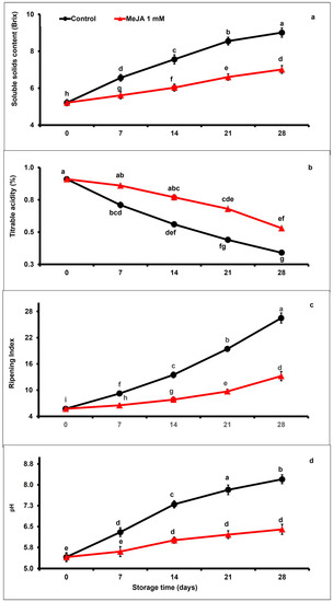 The content of the soluble solid increased moderately in fruit during the extension of storage. However, MeJA treatment decreased the soluble solid content more significantly than in untreated fruits throughout the storage period (Figure 4a). MeJA treatment markedly suppressed soluble solids content (0.77-fold) as compared with untreated fruits up to day 28 of storage (p < 0.05; Figure 4a).