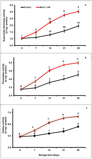 Malondialdehyde (MDA) content in papaya fruits gradually increased during postharvest storage. Nevertheless, exogenous MeJA treatment markedly suppressed the increase in malondialdehyde content with respect to control fruits. After day 28 of storage, the concentration of malondialdehyde was noticeably 1.39-fold lower in papaya fruits treated with MeJA than the control fruits (p < 0.05; Figure 2a).