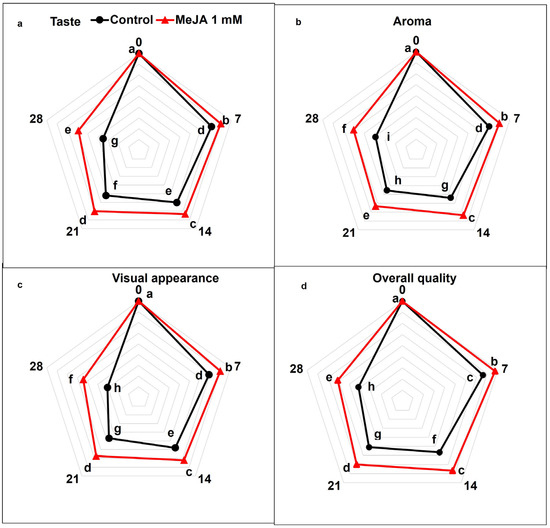The variation affecting taste (a), aroma (b), visual appearance (c), and overall acceptability (d) in papaya fruits following MeJA treatment. The data were acquired using three replicates, and the vertical bars represent the standard error of means. According to the least significant difference test (p < 0.05), mean values with different letters show statistically significant differences, whereas mean values with the same letters show no statistically significant difference.