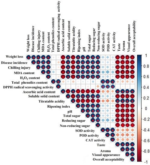 Pearson correlation coefficient heat map of various fruit quality attributes of MeJA-treated papaya fruit during low-temperature storage. The scale ranges from −1 to 1 (−1 = red, 1 = blue): red color represents negative correlation and blue indicate the positive correlation. The color gradient illustrates the intensity of the correlation. The symbol * denotes a statistically significant (p < 0.05) association.