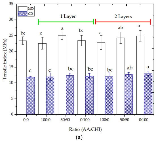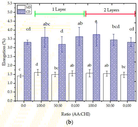 - Tanpichai, S.; Srimarut, Y.; Woraprayote, W.; Malila, Y. Chitosan Coating for the Preparation of Multilayer Coated Paper for Food-Contact Packaging: Wettability, Mechanical Properties, and Overall Migration. Int. J. Biol. Macromol. 2022, 213, 534–545. [Google Scholar] [CrossRef] [PubMed]