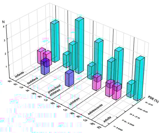 The maximum achieved contributions to respective PDEs are presented in Figure S3, emphasizing exposure to Pb as being of interest in each population group and Cu as the element with the highest contribution, e.g., for infants, 46.8% Pb, for toddlers, 67.2% Cu and 39.3% Pb, and for preschool children, 52.0% Cu and 20.3% Pb. These two elements also dominated the mean/high level of PDE contribution: for toddlers, 6.9/34.0% Cu and 8.5/29.4% Pb; for preschool children, 1.9/7.6% Cu and 2.1/8.8% Pb (further decreasing with age) (Table S5). Considering that Pb was a class I element, these levels could not be considered harmless, even though the high levels were substantially lower than the maximum ones. Among other elements, the ones contributing more than 1% of PDE at high exposure levels were class I elements As (up to 2.1%, toddlers), Cd (up to 2.9%, toddlers), and Hg (maximum 3.4%, preschool children); then V and Ni (class II) and Ba (class III) (with the exception of V and Ba in adults), whereas the mean contribution levels remained below 1% of PDE for any supplement-element-consumer combination. Chronic exposure to Cd has been associated with renal disease, thyroid disruption, and weakened bones; Hg might cause neurological disorders, motor, renal, cardiovascular, immune, and reproductive dysfunction [8,11].