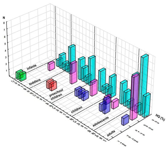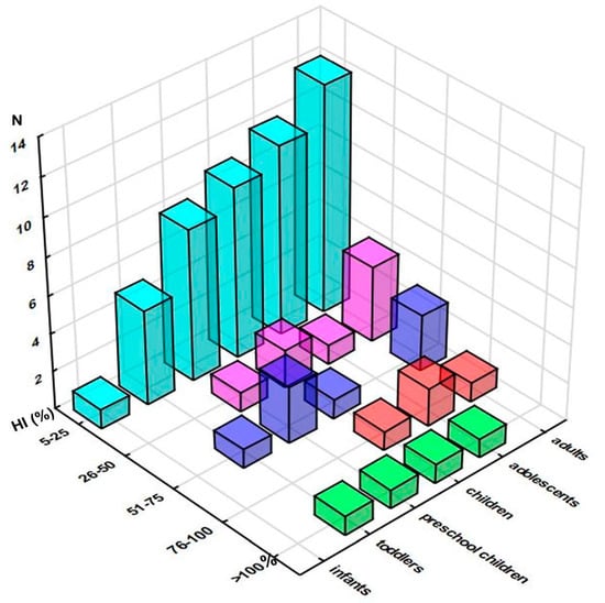 Hazard index values greater than 100% were obtained for only one of the investigated samples (Table S6), intended for toddlers (229%), preschool children (177%), children (123%), and adolescents (105%) (Figure S5). The distribution of the obtained HI values, presented in Figure 3, as expected, resembled the one of HQ: the vast majority of the samples did not exceed the 25% level, and the following quartiles were populated with up to four samples (adults), three (preschool children and adults), and two samples (adolescents).