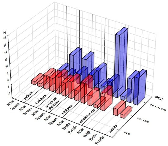 The number of data points distributed over the 101–1000 MOE range varied considerably, depending on the population group and selected effect, reaching a maximum of 18 samples for adults’ exposure to As with the lower BMDL limit criterion. The minimum MOE levels obtained for each population group—element/effect combination—are presented in Figure S7, displaying neurotoxicity of Pb as the most prominent concern for infants (MOE 11) and toddlers (MOE 13), while As exposure in preschool children caused the highest concern (MOE 15). MOE corresponding to high As exposure ranged from 50 (toddlers) to 74 (children) in paediatric groups, whereas in the case of Pb, high level MOE for neurotoxicity in toddlers and all children ranged from 19 and 45, while MOE for nephro/cardio-toxicity in adolescents and adults were 54/127 and 82/196, respectively (Table S7). Chronic exposure to As has been associated with dermal lesions, carcinogenic effects, impairment of the reproductive system, and atherosclerosis [20]. Pb exposure could affect neurotransmitter release and haemoglobin synthesis, which might result in nervous, haematological, reproductive, renal, and digestive effects [8,11,35]. Pb has been known to induce renal tumors, reduce cognitive development, increase blood pressure, and cause cardiovascular diseases in adults [8]. Children are particularly sensitive to Pb exposure, leading to decreased intelligence quotient, learning disabilities, and impairments of behavior [8,44].