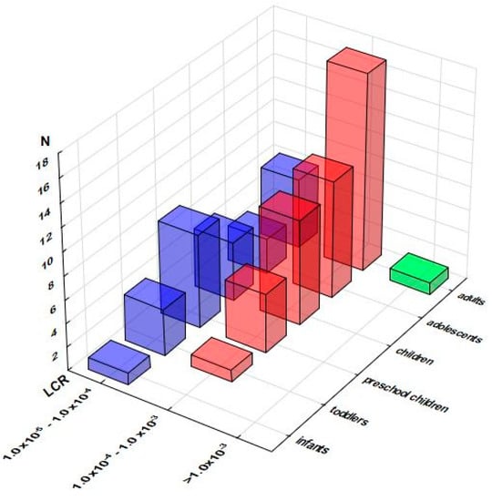 Distribution of the samples according to the consequent Lifetime Cancer Risk (LCR) related to As effects across the population groups (number of the samples in selected LCR range). Note: only samples with LCRs above 1.0 × 10−5 are presented.