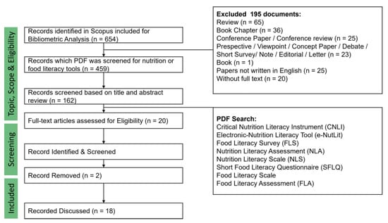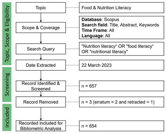 Flow diagram of the search strategy for bibliometric analysis. The query used in the title, abstract, and keywords was: “Nutrition literacy” OR “food literacy” OR “nutritional literacy”.