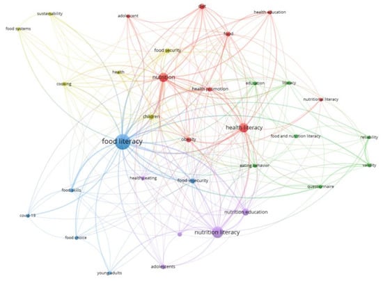 Author’s keyword network visualization. Unit of analysis = author keywords; counting method: full counting; minimum number of occurrences of a keyword = 10; cluster size = 5. The size of the circle of a keyword is determined by the number of occurrences. The query used in the title, abstract, and keywords was: “Nutrition literacy” OR “food literacy” OR “nutritional literacy”.