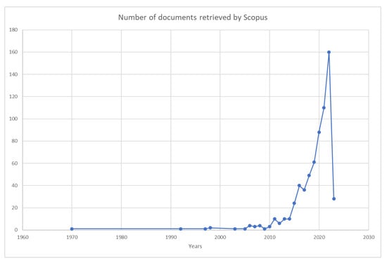 The researcher can track the development and evolution of the study subject over time by looking at documents according to the year of publication. The first paper retrieved by Scopus was published in 1970 in the Journal of Nutrition Education and has the title “Nutritional literacy of high school students” and the authors are Johanna Dwyer, Jacob Feldman, and Jean Mayer. The goal of this first cross-sectional study was to evaluate nutrition instruction and knowledge among high school students in a major city []. The second article retrieved by Scopus was published in 1992. Papers were published every year after 2005 (Figure 4). However, this does not necessarily mean that no scientific documents related to food literacy or nutrition were produced before 1970 or during the gap years. By examining the cited bibliography list of Scopus-retrieved papers and the list of papers that cite them, it is apparent that such documents exist. The reason for the absence of publications during those years could be the fact of researchers did not use the terms “nutrition literacy” and “food literacy”. Studies defining these concepts appeared only in the early 2000s, such as Blitstein et al.’s (2006) [] paper on nutrition literacy and Kolasa et al.’s (2001) [] paper on food literacy.