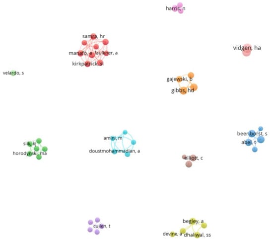 Network visualization map of co-authorship research. The size of the circle is determined by the total number of citations received by all documents published by the author. The distance between two authors in the visualization approximately indicates the relatedness of the authors in terms of co-authorship links. In general, the closer two authors are located to each other, the stronger their relatedness. The strongest co-authorship links between authors are also represented by lines. The query used in the title, abstract, and keywords was: “Nutrition literacy” OR “food literacy” OR “nutritional literacy”.