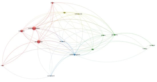 Researchers from 75 different countries contributed to the publication of the retrieved documents. The United States ranked first with a total of 150 (22.94%) documents, followed by Australia (18.96%) and Canada (10.70%). This agrees with topmost prolific authors results. The greater interest in food and nutrition literacy research in the United States and Australia may be related to the high rates of obesity and other diet-related health issues. In 2019, adult obesity rates in the United States reached 42.8%. In Australia, the adult obesity rate was 30.4% in 2017 []. Figure 6 displays a visualization describing collaboration between countries, specifically focusing on countries with a minimum productivity of 10 documents. The map shows a total of 15 countries that are divided into four distinct clusters, each represented by a different color. This visualization provides an overview of the collaborative relationships among these countries in the research endeavor.