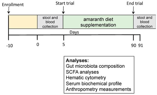 During the intervention period, the daily popped amaranth intake was supervised. Blood and stool samples were taken before and after the study. The primary outcomes were gut microbiota composition and SCFA profile, while a secondary outcomes was the hematic biochemical profile.