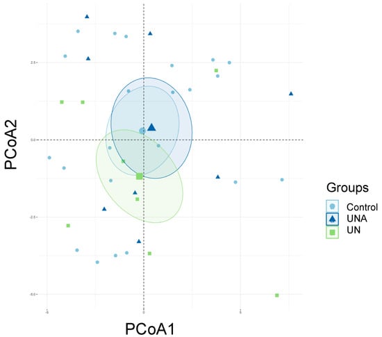 Previous reports have indicated that children with undernutrition show lower gut microbiota diversity [,,], which agrees with the observed results in the present work. It was also reported that the Shannon index showed a tendency to decrease in malnourished children with protein malnutrition (Kwashiorkor), although no significant values were reported []. It is known that results in humans are sometimes not statistically significant because of the intrinsic variation among people, but they are clinically relevant as they reflect a clear trend []. The beta diversity reflects the differences in the gut microbial composition of different groups and is represented by non-metric multidimensional scaling (NMDS) or PCoA, based on the Bray–Curtis dissimilarity. As shown in Figure 3, PCoA analysis showed a difference in the gut microbiota between the Ctrl and UN groups; however, after amaranth consumption, the UNA group tended to be more like the Ctrl group.
